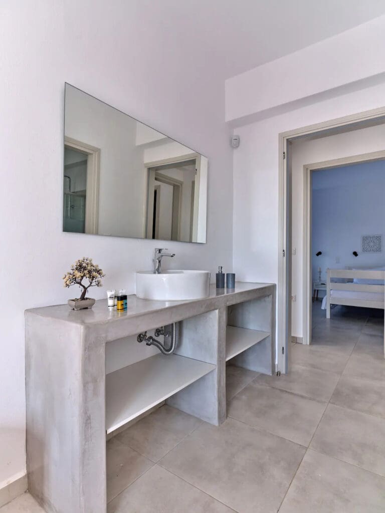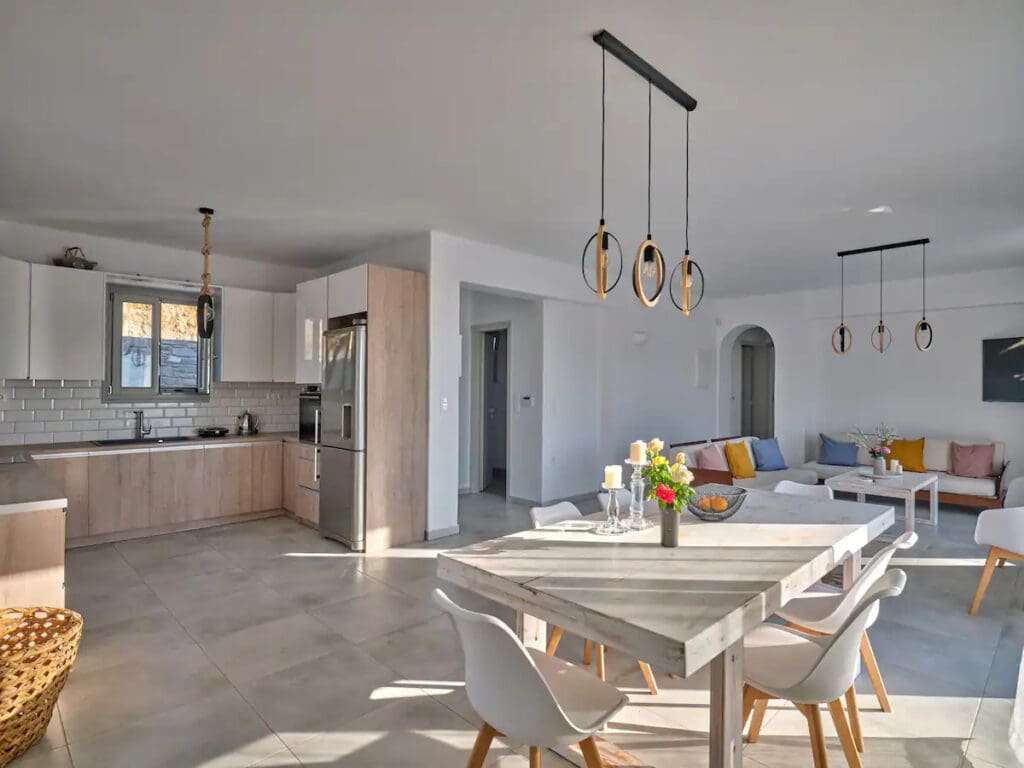 The fully-equipped kitchen caters to culinary aficionados, while the outdoor terrace is a serene spot for relaxation and social gatherings, under Paros' expansive sky.