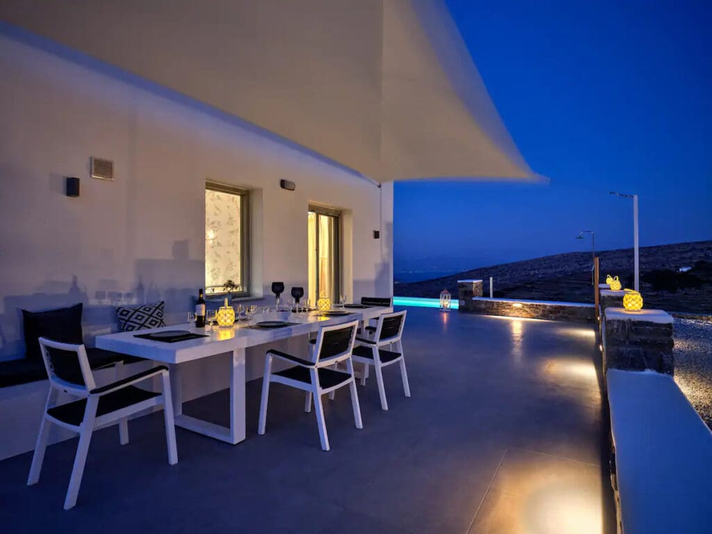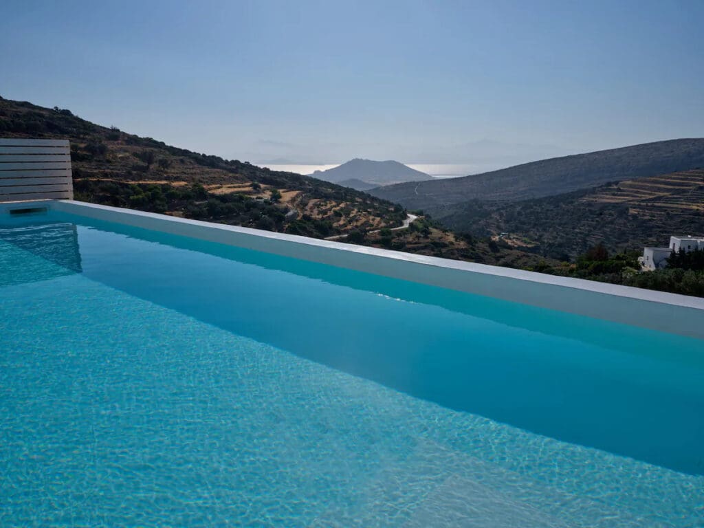 Η εντυπωσιακή είσοδος υπόσχεται μια αίσθηση ανεπανάληπτης κομψότητας, με τρία ευρύχωρα υπνοδωμάτια που είναι εξοπλισμένα με πολυτελή έπιπλα, ιδιωτικές βεράντες, τηλεοράσεις, και en suite μπάνια, δύο εκ των οποίων διαθέτουν αποκλειστικά χρήση τζακούζι. Η κομψή τραπεζαρία, με τις μεγάλες γυάλινες πόρτες της, ανοίγει προς την πισίνα και την ευρύχωρη βεράντα, συνδυάζοντας την εσωτερική πολυτέλεια με το φυσικό κάλλος της Πάρου.