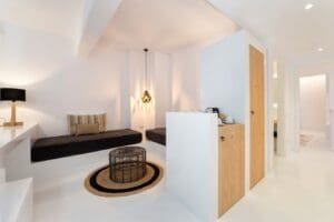 Our five Cycladic-style buildings, nestled atop hills overlooking the Aegean Sea and Parikia, boast a timeless charm. Immaculately landscaped gardens lead to elegantly furnished indoor spaces adorned with classic artwork, offering a refined aesthetic that extends to our rooms and suites.